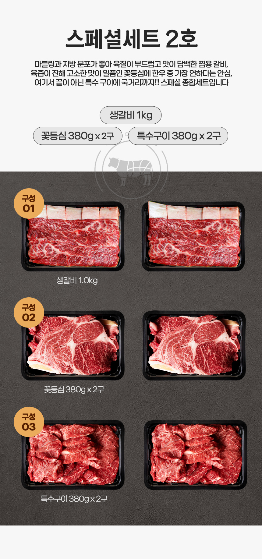 마블링과 지방 분포가 좋아 육질이 부드럽고 맛이 담백한 찜용 갈비, 육즙이 진해 고소한 맛이 일품인 꽃등심에 한우 중 가장 연하다는 안심, 여기서 끝이 아닌 특수 구이에 국거리까지!! 스페셜 종합세트입니다.